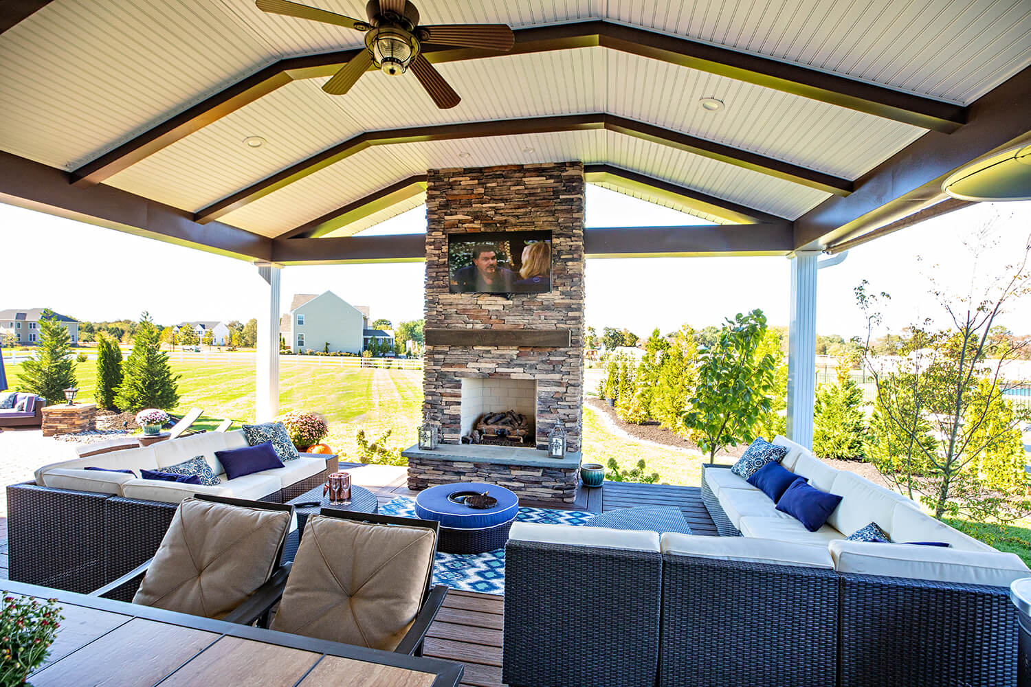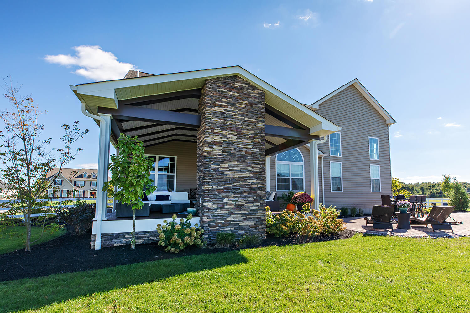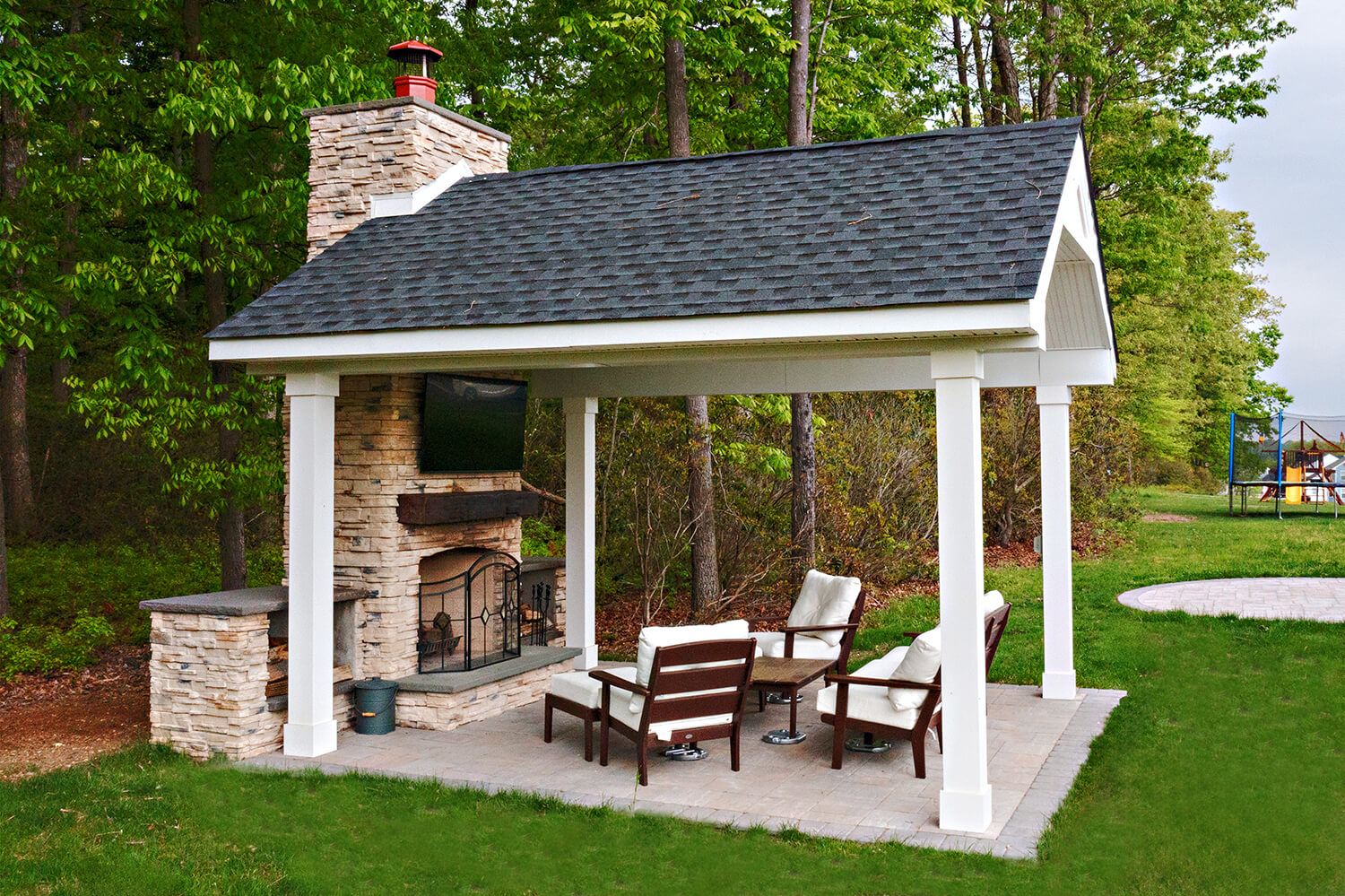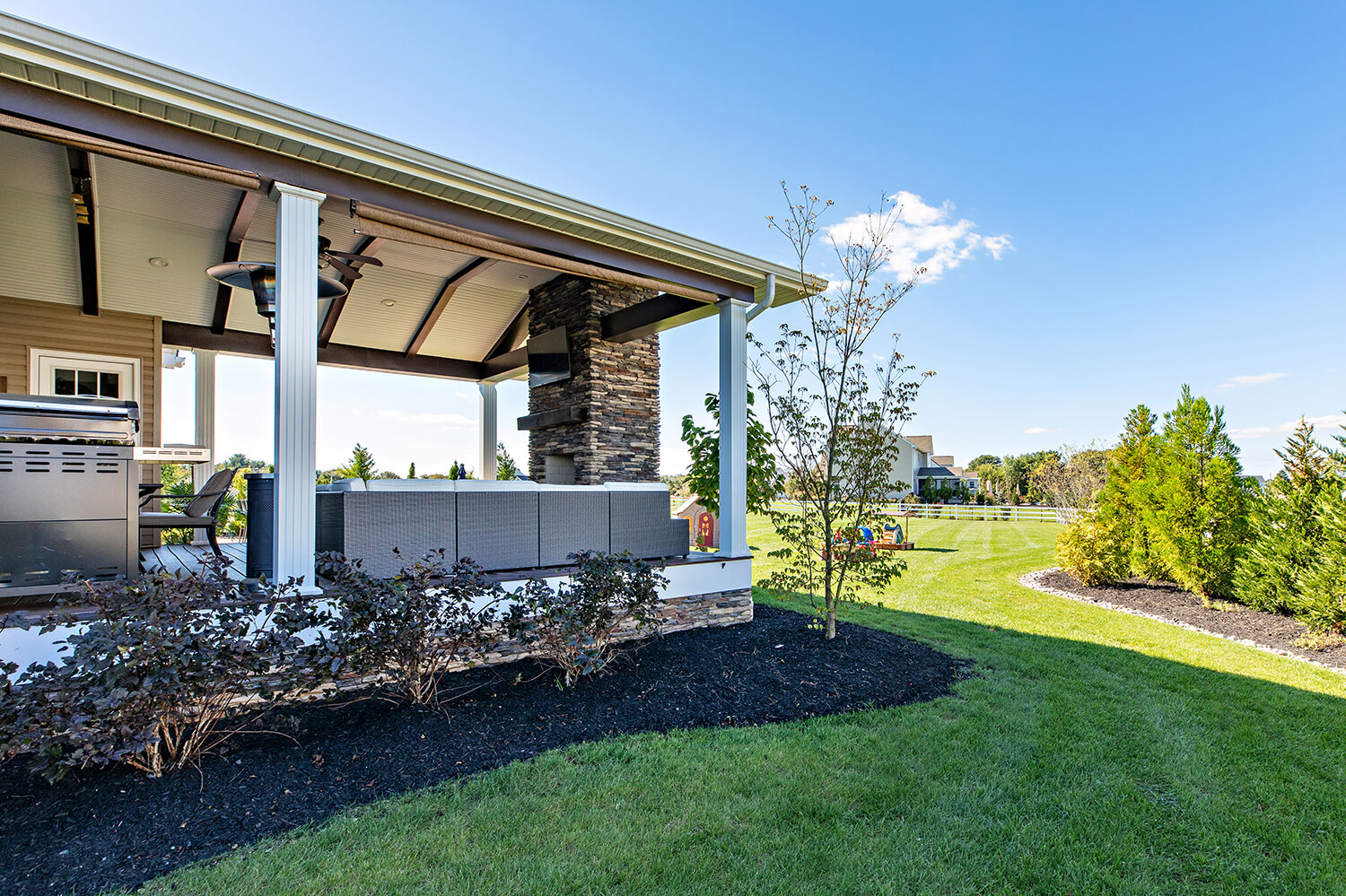 A well-crafted roof structure brings shade and year-round comfort to your outdoor living spaces – perfect for family gatherings, quiet mornings, or evenings by the grill. Whether it’s a classic pavilion, a modern pergola, or a fully covered outdoor room, these custom builds blend style and function. Browse the gallery to see how these covered spaces can complement your design, making everyday moments feel a little more luxurious. Explore the gallery for ideas.