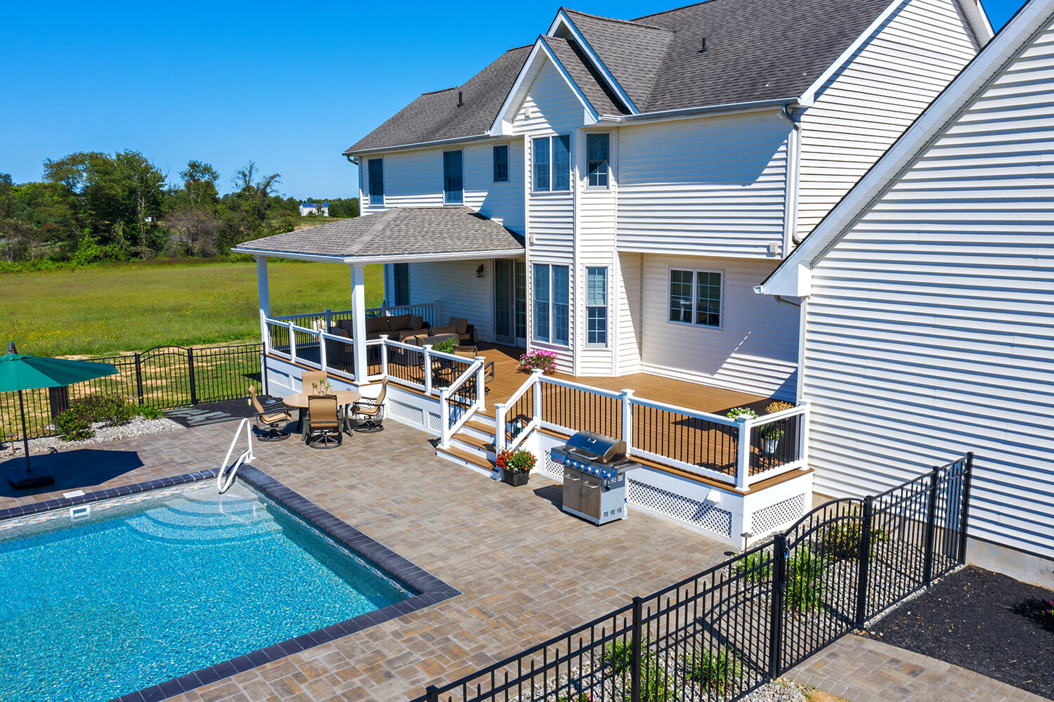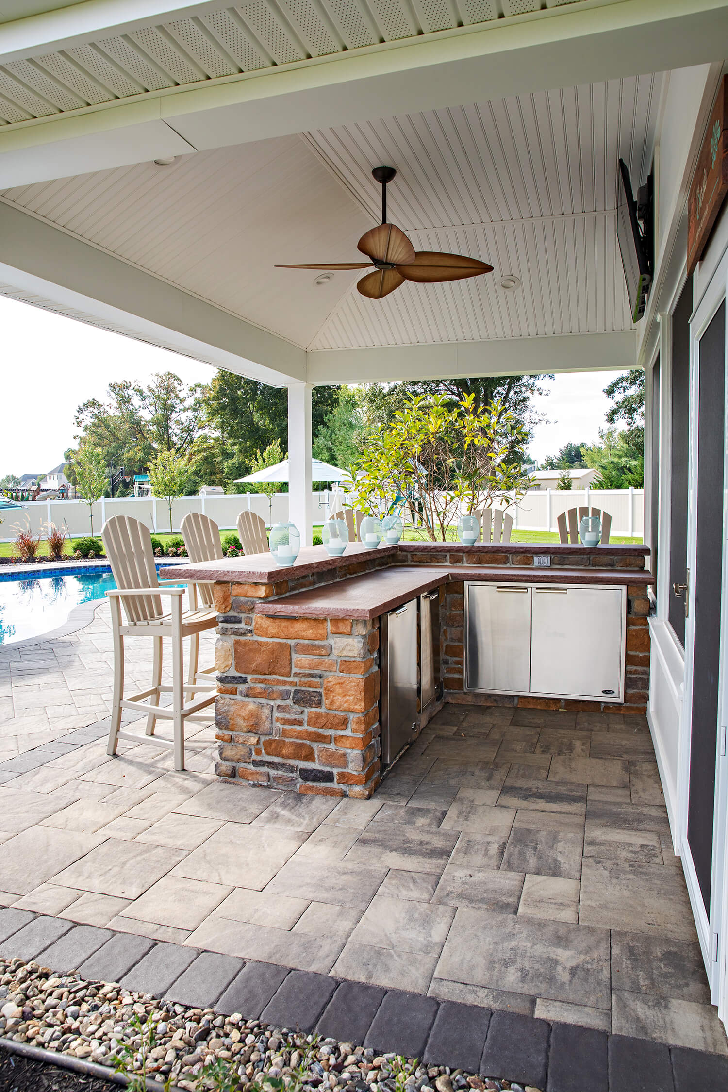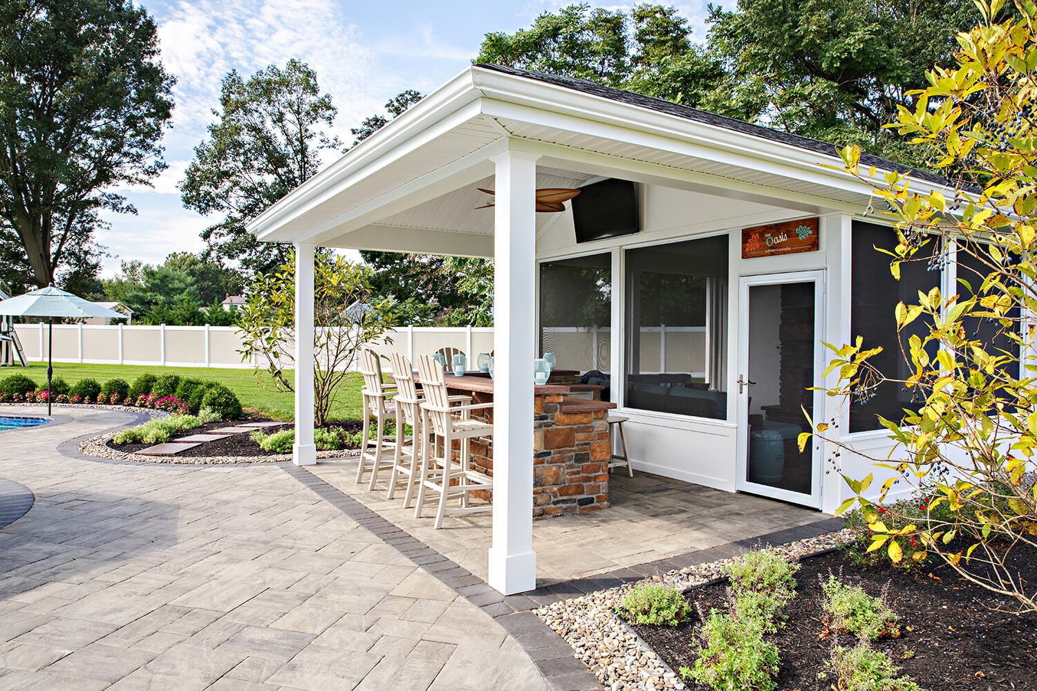 A well-crafted roof structure brings shade and year-round comfort to your outdoor living spaces – perfect for family gatherings, quiet mornings, or evenings by the grill. Whether it’s a classic pavilion, a modern pergola, or a fully covered outdoor room, these custom builds blend style and function. Browse the gallery to see how these covered spaces can complement your design, making everyday moments feel a little more luxurious. Explore the gallery for ideas.