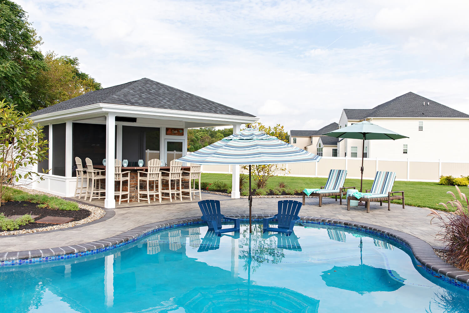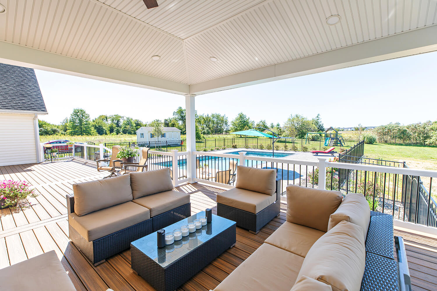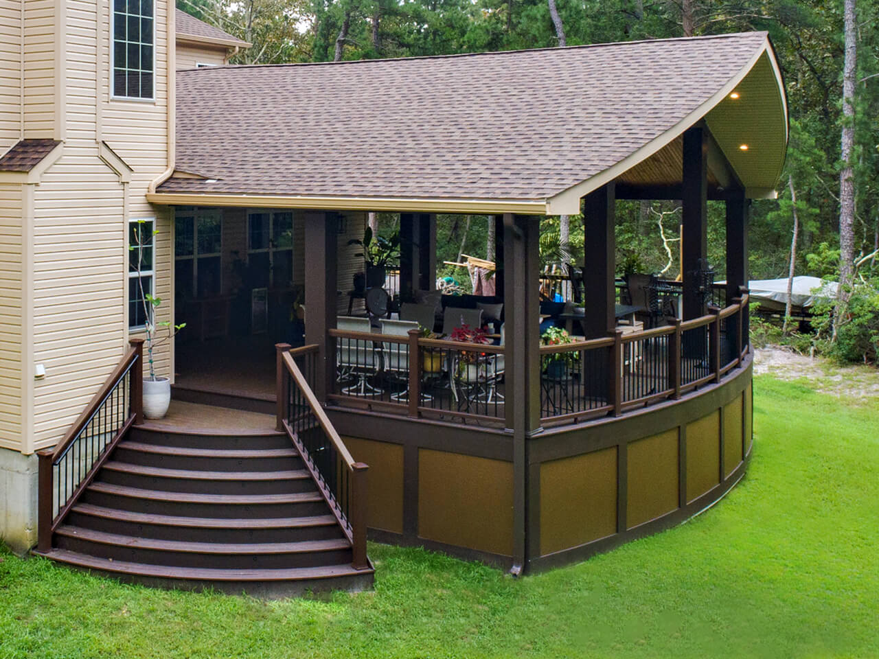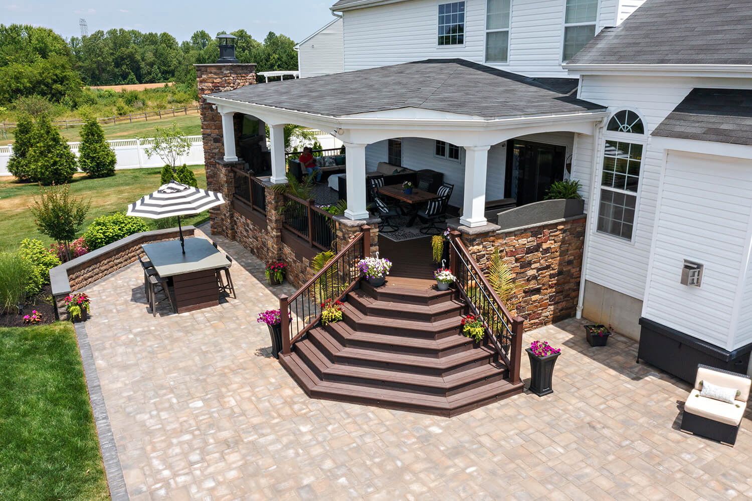 A well-crafted roof structure brings shade and year-round comfort to your outdoor living spaces – perfect for family gatherings, quiet mornings, or evenings by the grill. Whether it’s a classic pavilion, a modern pergola, or a fully covered outdoor room, these custom builds blend style and function. Browse the gallery to see how these covered spaces can complement your design, making everyday moments feel a little more luxurious. Explore the gallery for ideas.